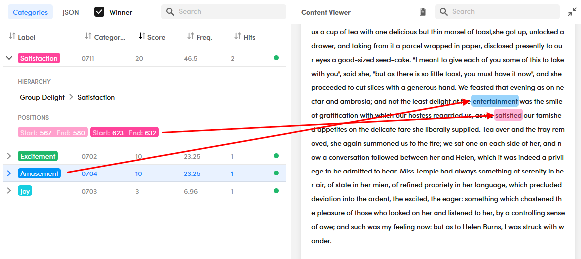 arrows to show and hide the phrase positions in the text. - Select a phrase to highlight all its occurrences in the text of the Content Viewer tab. Deselect it to remove the highlight.