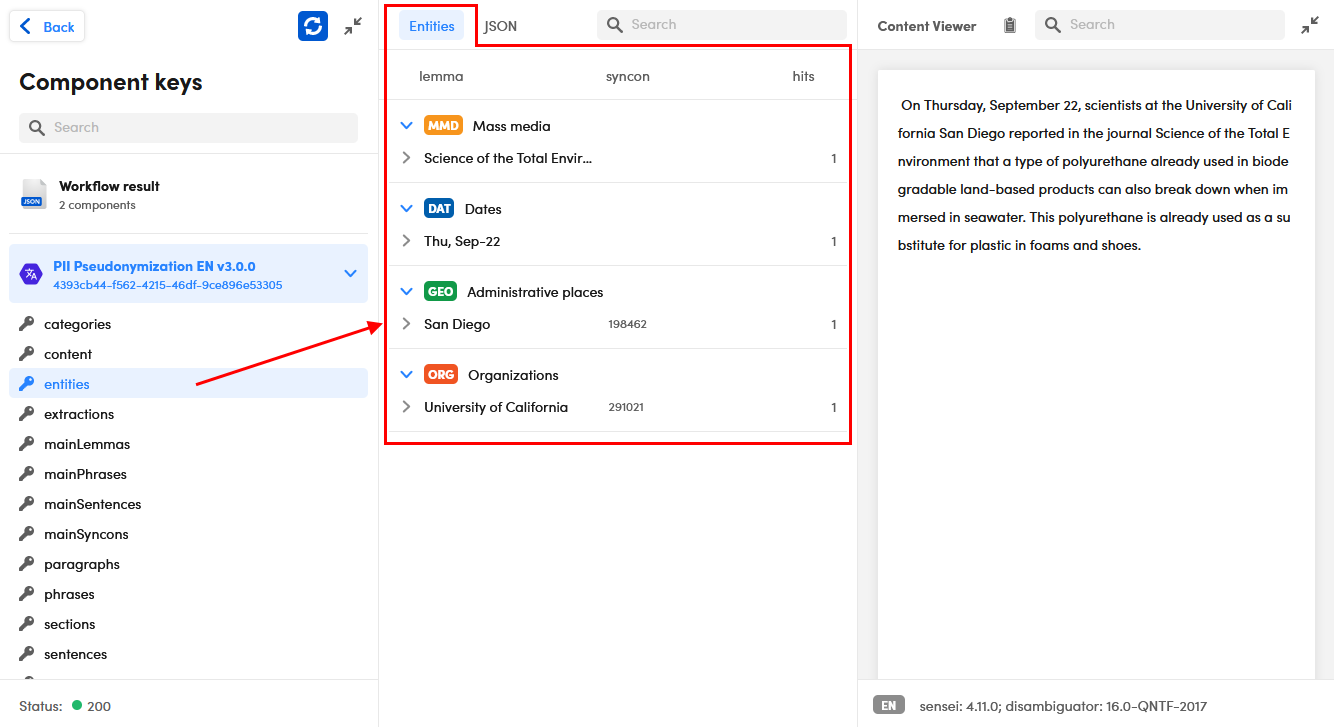 The Entities tab of the homonymous sub-key shows the entities detected in the text, in particular: