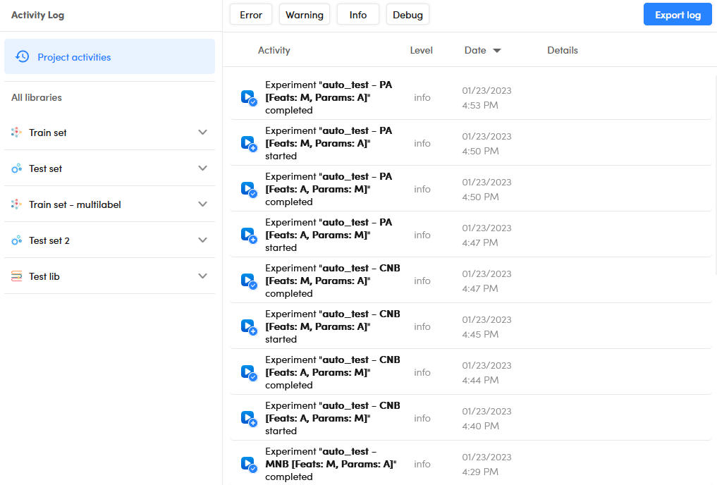 - To see only the activities related to a certain experiment, expand the library it refers to in the left panel, then select the experiment from the list that appears below the library name.