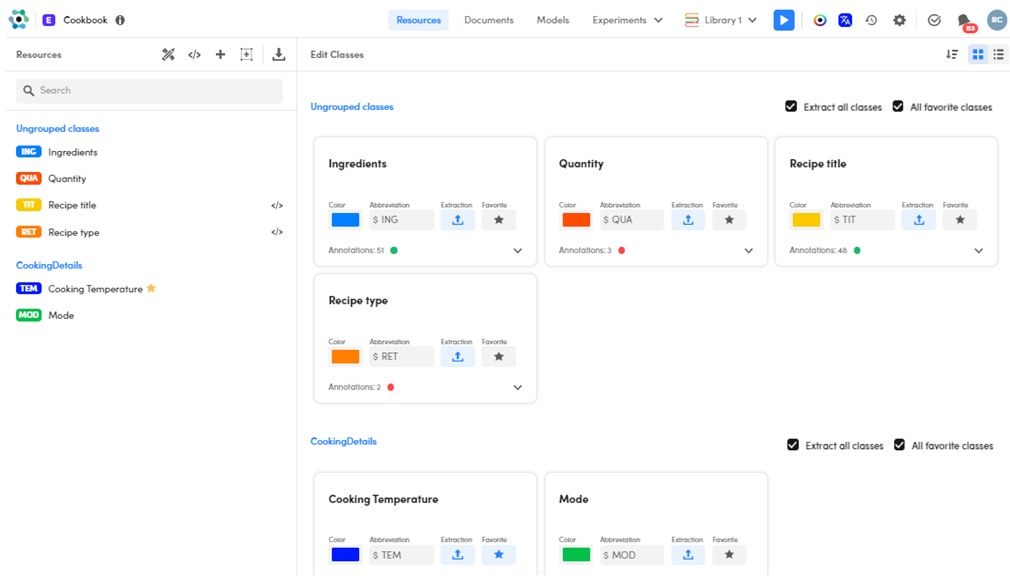 The Resources tab allows you to manage the classes of information to extract and the documents' sections.
