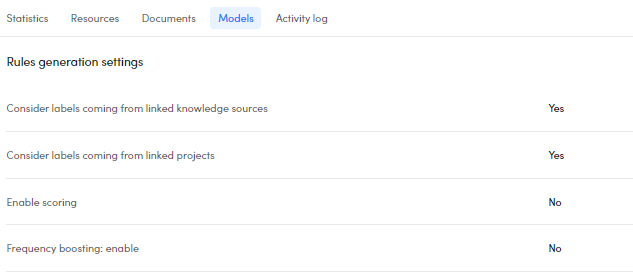 The Rules generation settings area reports all the experiment parameters with their corresponding values set before the experiment start.