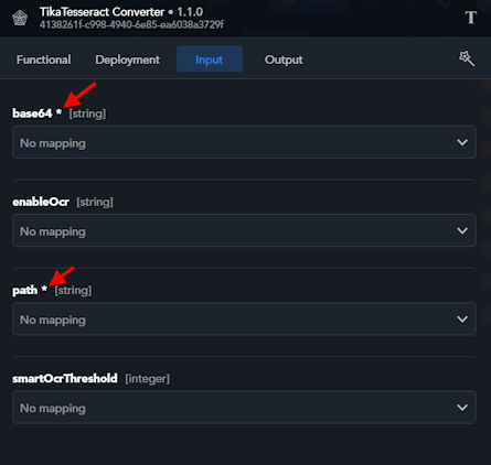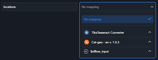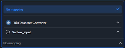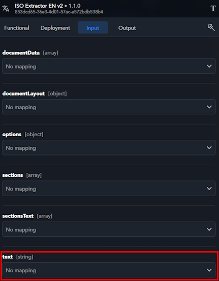 Each input property consists of the name of the input variable, with the type indicated in square brackets, and a drop-down list to choose the corresponding output key of an upstream block, so to create the mapping.