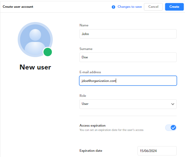 - To set an expiration date for the user's access, use the Access expiration toggle switch. When activated, set the Expiration date field.