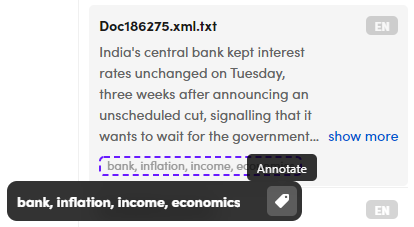Annotating a document means to manually select a category for a text. The selected category is visually represented by an indigo chip . It is an operation initially performed in the training library, but it is also important for the test library.