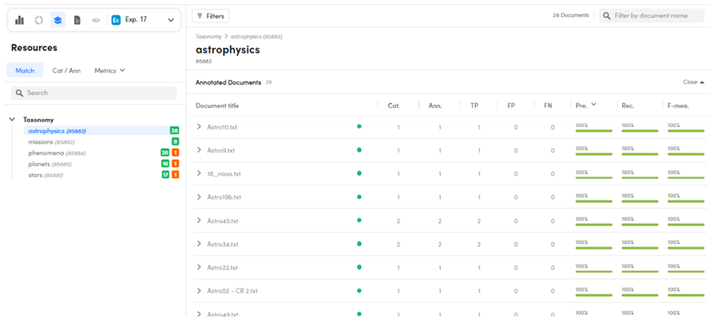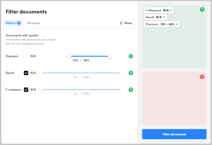 - Adjust the rate with the cursor for Precision, Recall and F-measure or select N/A to filter the documents with indefinite quality.