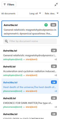 For the documents in the list, information relating to annotation and to the experiment—such as the categories or the number of extractions—is reported below the text abstract. In the case of categories, the first two are shown: if there are more, the number of excess categories preceded by the plus sign is displayed on the right.