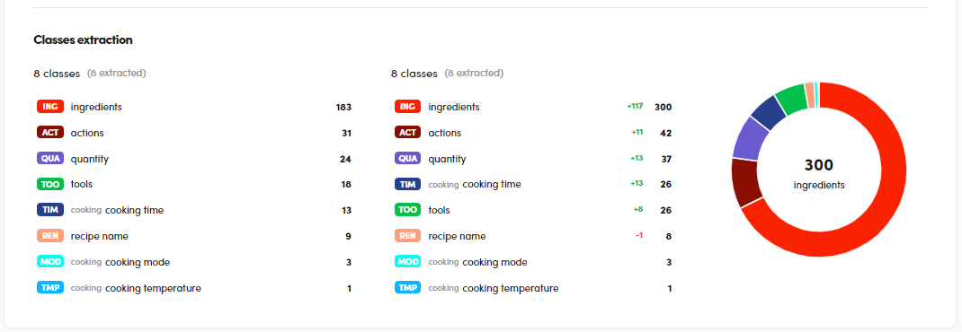 Red numbers with the minus sign indicate a decrease of the total of extractions, annotations and metrics of a class.