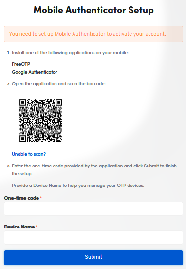 - Enter the one-time code (OTC) provided by the mobile authenticator.
