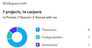 The Workspace info panel summarizes in a pie chart all your projects and corpora. Each project type is associated to a color.