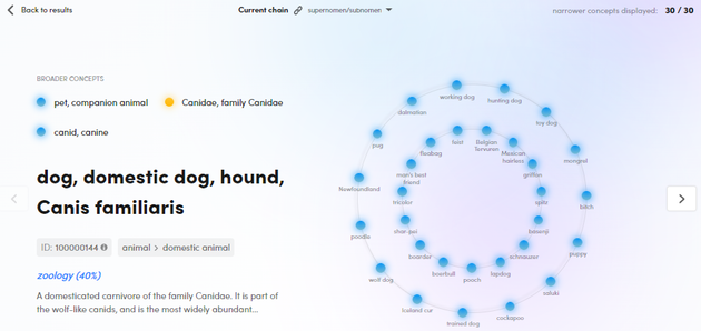 The graph on the right side of the page represents the IS-A hierarchy—also called supernomen-subnomen link chain—of concepts that descend from the root concept corresponding to the selected tab in the strip at the bottom of the page. The number of concepts that are displayed is indicated at the bottom left. It can be limited to a maximum value.