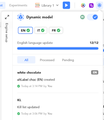 Dynamic models—one for each chosen project language—are models that, instead of being generated in experiments, are generated once and then continuously updated to reflect any changes to project's taxonomy, advanced extraction rules and kill lists.