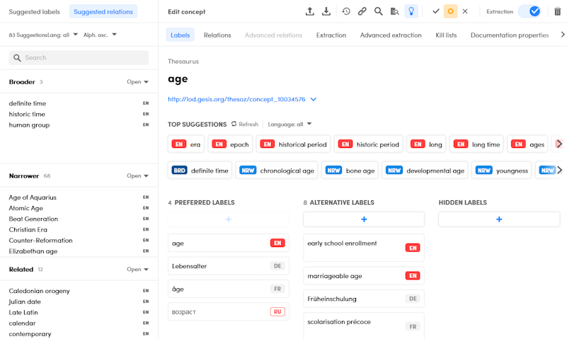 Suggested labels lists possible additional labels, while Suggested relations lists concepts that are in a broader, narrower o related relationship with the current concept.