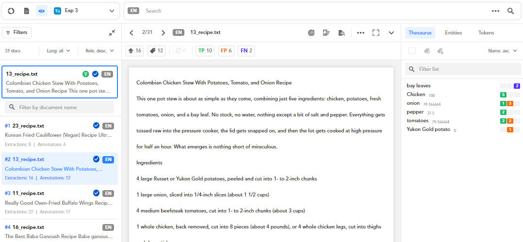 As you can see, the latest experiment—Exp 3— is in focus and the values of chicken are now true positives. This means that after Exp 1 and before Exp 3 the values of chicken have been turned into true positives.