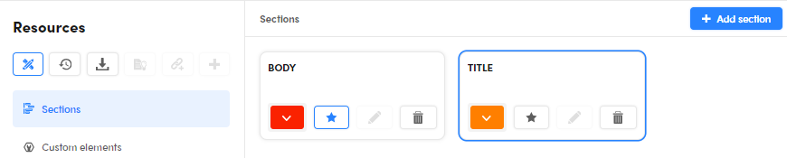 The definitions of documents' sections are managed in the Sections tab of the Resources panel, located in the Resources tab of the project dashboard.