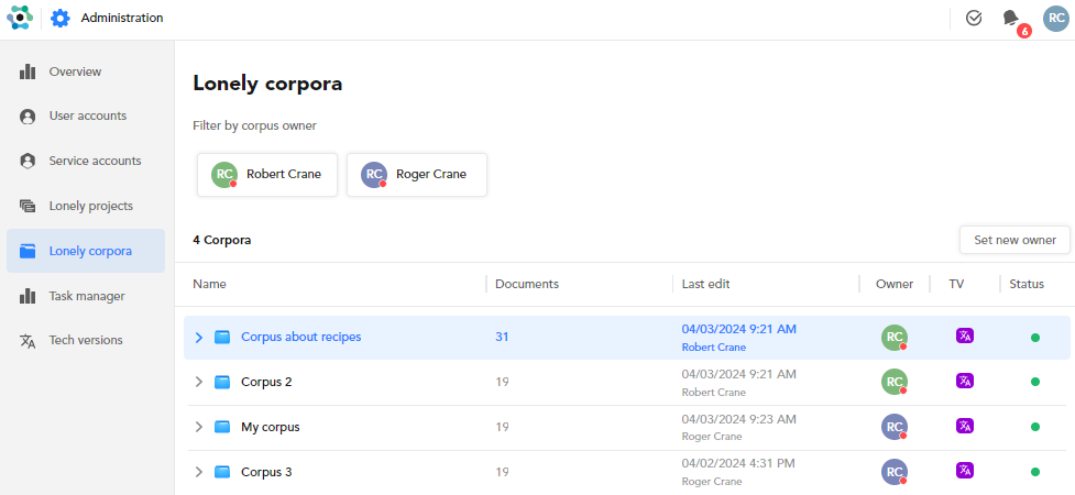 The Lonely corpora tab of the Administration dashboard allows users belonging to the Owner role to manage the ownership of corpora belonging to users that have been disabled.