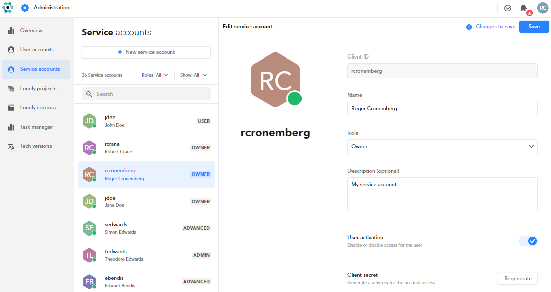 Apart from the authentication mechanism, service accounts are users like the others: they can belong to the same roles, human users can share projects with them, they are owners of the projects they create programmatically and, also programmatically, if they belong to the Owner role, they can change the ownership of projects and corpora.