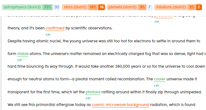 Hits are differently highlighted based on their quality. Hits referring to true positive categories are highlighted in green and the text color is green. Hits referring to false positive categories are highlighted in orange and the text color is orange. Below the underlining, hover over CAT to expand its tooltip.