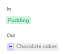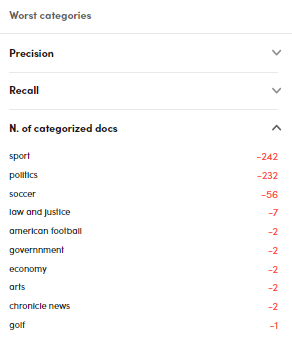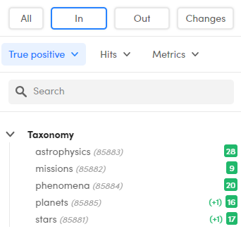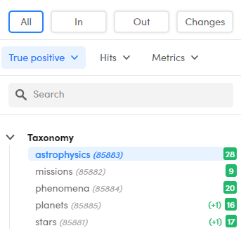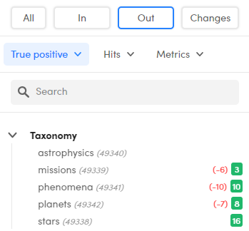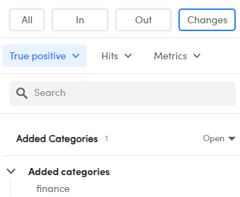 The colors logic for the chips is the same described for Out categories above. The blue chip states that the category turned from a false negative into a true positive. The green chip states that the category turned from a true positive into a false negative.