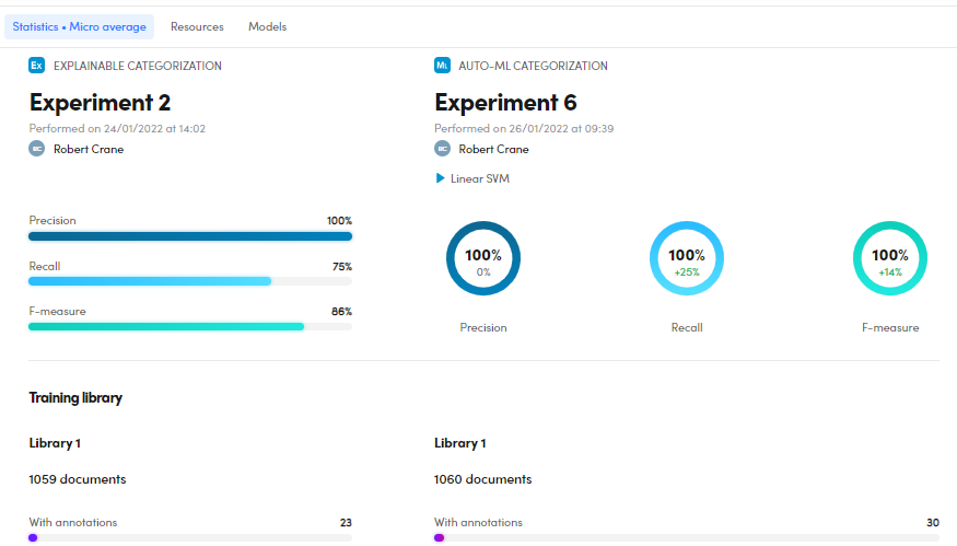 To compare the training library in terms of number of documents with annotations, check the Training library area.
