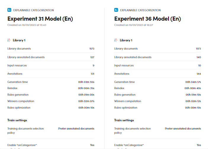 When comparing two experiments, a new information box is available, N. of categorized docs, listing the number of documents categorized with the categories listed in the box compared to the other experiment.