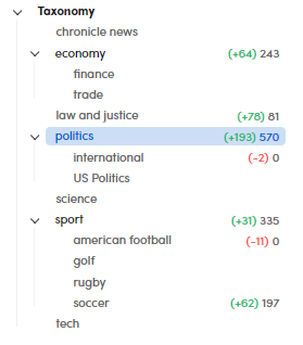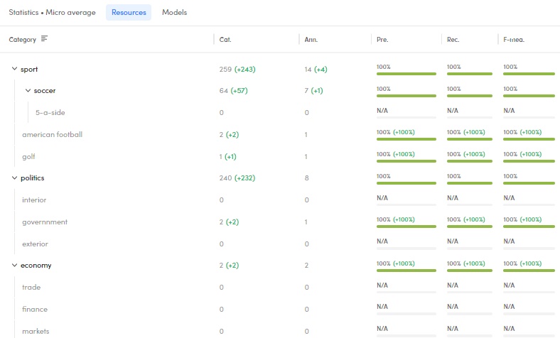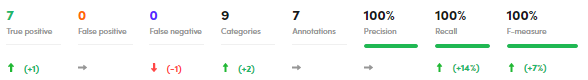 Green numbers with the plus sign indicate an increase in number of category hits, annotations and metrics. Vice versa, red numbers with the minus sign indicate a decrease in number of category hits, annotations and metrics.