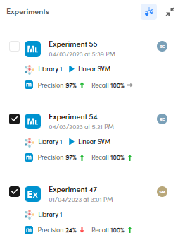 - To compare the number of true positives, false positives and false negatives between the experiments, select an option from the Match dropdown menu.