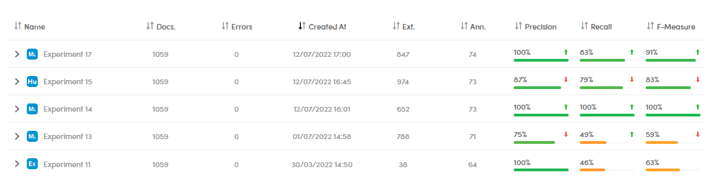 On top of the panel you can see the last experiment performance date and time, the author, the analyzed documents, the documents with categories, with annotations, the library used, Precision, Recall and F-measure metrics.