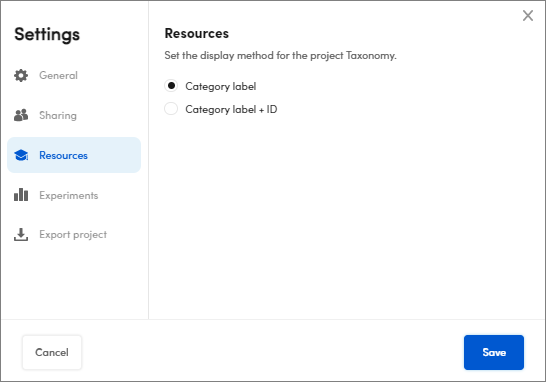 - Select Category label + ID to view the taxonomy labels and a unique ID for each one of them in the Resources tab, Taxonomy panel.