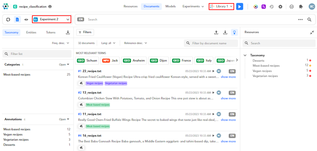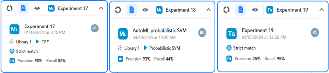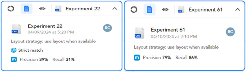 - In case an experiment has been performed, on the right of the analyzed documents there are performance date and time.