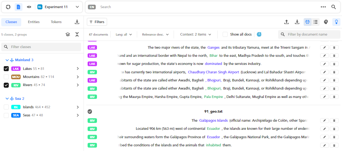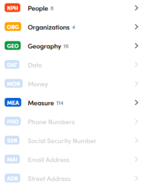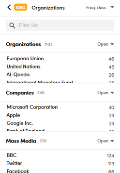 In the Entities tab you find an item for each named entities type or group of types. For example, Geography and Organizations are groups of types: the former includes buildings and environments, the latter companies and mass media.