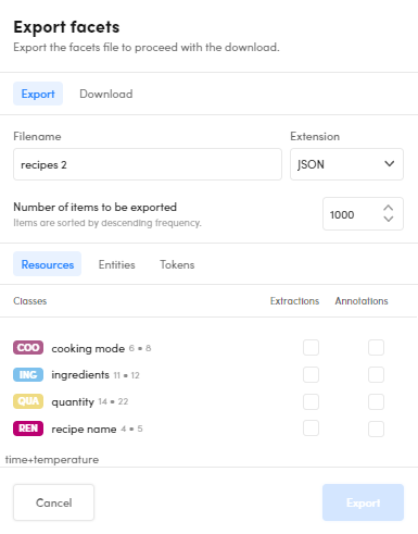 on the left panel toolbar. The Export facets dialog appears.