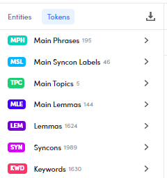 In the Tokens tab you will find all the other information obtained from the text tokens of the documents during the NLU analysis.