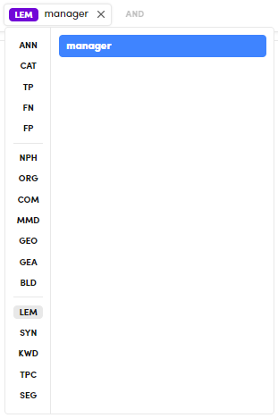 A menu appears showing possible element types, including annotations and project resources—categories, classes, concepts, depending on the project type—which, in case there is an experiment in context, are searchable features of documents.