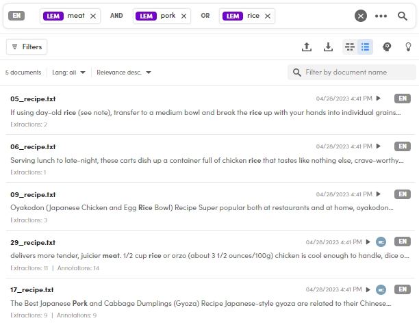 Through it you can set and apply search criteria to filter the documents of the current library or corpus.