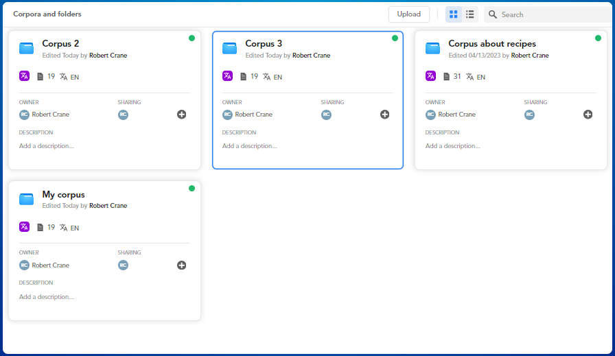 to view your corpora in a table format. - Select Show card view