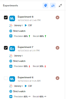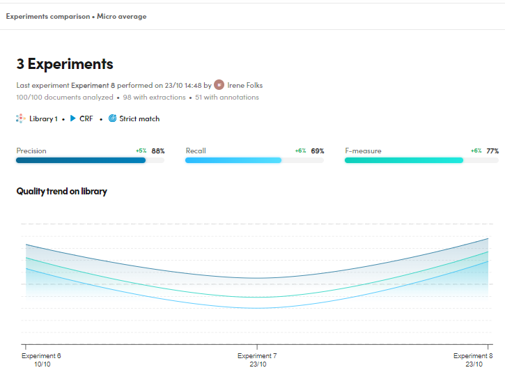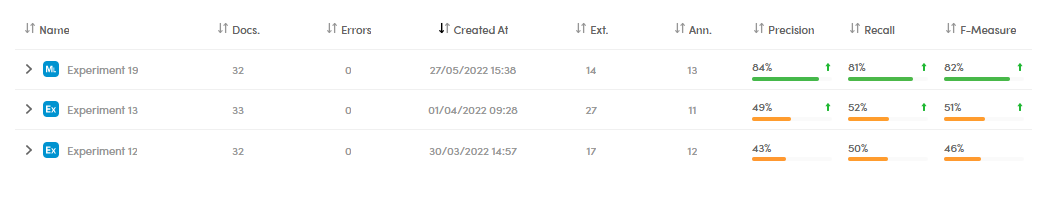 The experiment list displays a summary of the experiments features and their main quality indicators. Ext. represents the number of extractions, while Ann. represents the number of annotations.