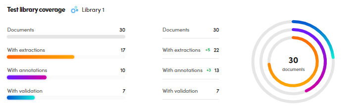 You can check the differences in terms of documents, documents with extractions, with annotations and validated documents and also the differences in number of variations (delta).
