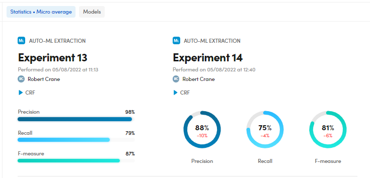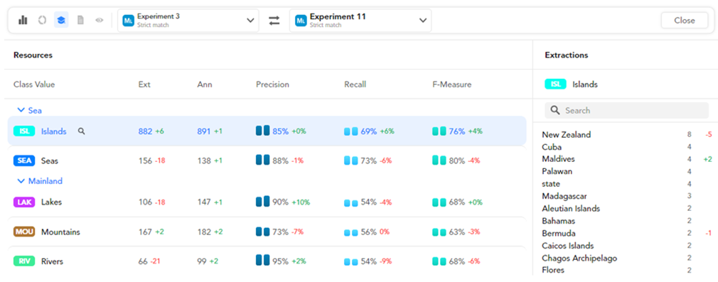 Check the class list and the related statistics and metrics like extractions (Ext), annotations (Ann), Precision, Recall and F-Measure regarding the experiment in focus and the differences with the compared one.