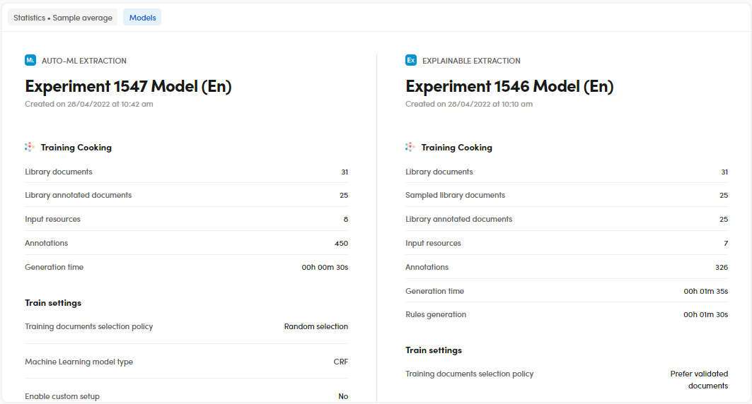 The Models tab compares the two models of the experiments and displays a list of data: