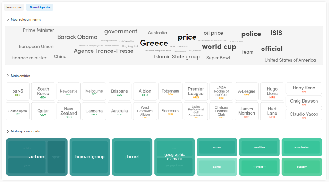 To filter documents based on main relevant terms, main entities and main syncons, double-click the related items of your interest.