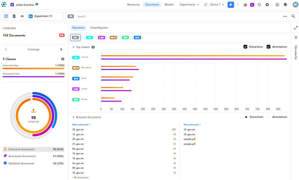 - To Filter the resulting classes after the experiments, double-click Extracted documents.