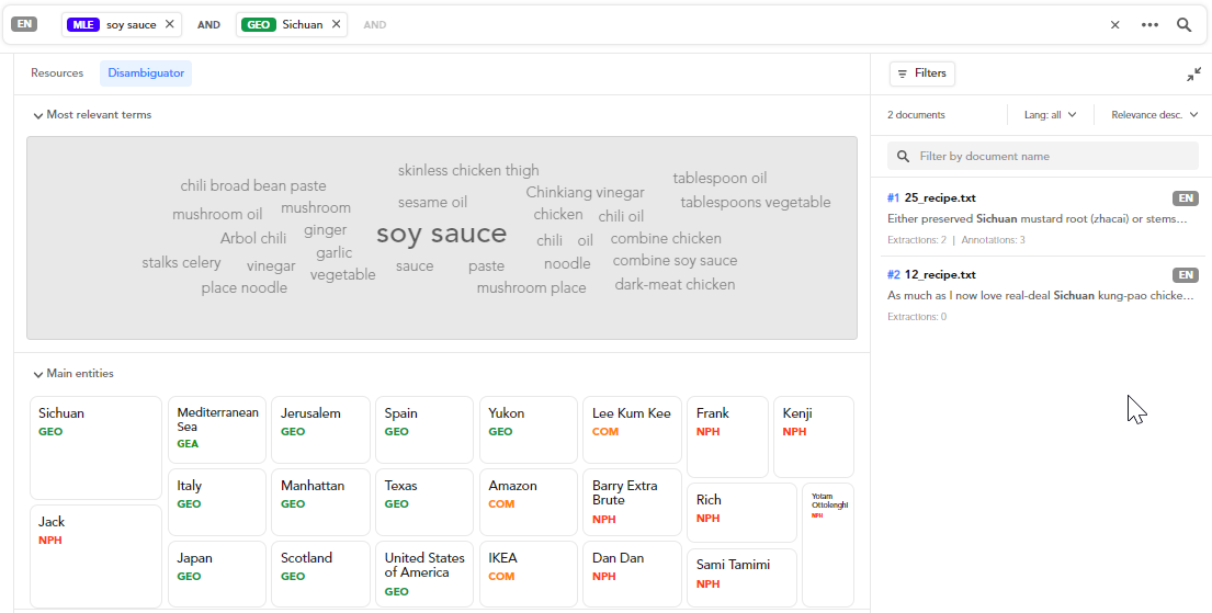 If you want to filter the documents that contain the value soy sauce as Most relevant terms and Sichuan as Main entities: