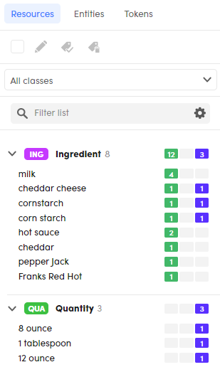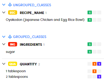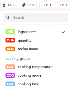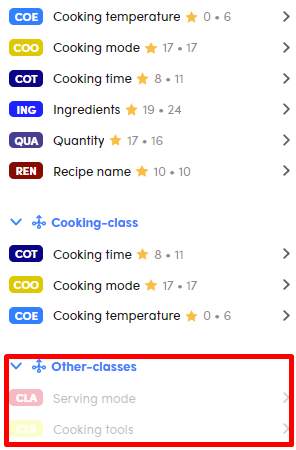 The two numbers next to each class name are, respectively, the number of distinct values that have been extracted by the model experiment and the number of distinct values that have been annotated.