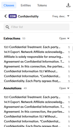 Select the dropdown menu—set on All classes by default— to expand a class. When you expand a class, you see two lists: Extractions and Annotations. The information and the actions that can be performed are the same described about the list view when a class is expanded.