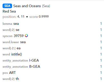 For CRF models, also the name, the value and the number of occurrences of the text features that determined the prediction are shown.