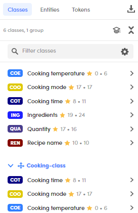 To expand the lists of extracted and annotated values for a class, select it or select the chevron icon