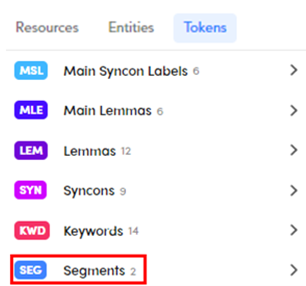 Segments are part of the output of experiments based on CPK models imported from Studio. When detected, they are listed under the Tokens tab, which is inside the left panel in list view and inside the right panel in detail view.