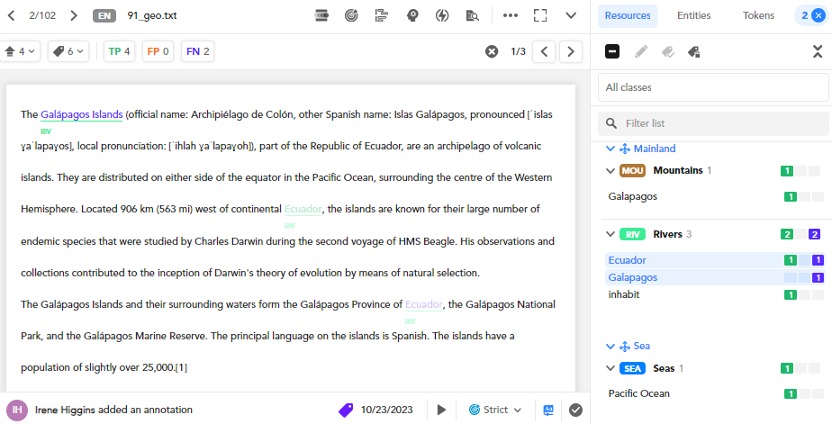 - Select the value of interest. The lists of extractions and annotations of the class values will appear as described in the list view.