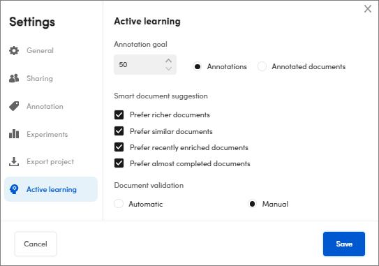 - Enter the Annotation goal that is the manual annotation amount to perform (min 50) or the number of manual annotated document (min 10) to start the annotations suggestions generation.