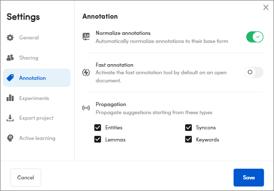 Switch on Normalize annotations, if you want to automatically normalize annotations to their base form.